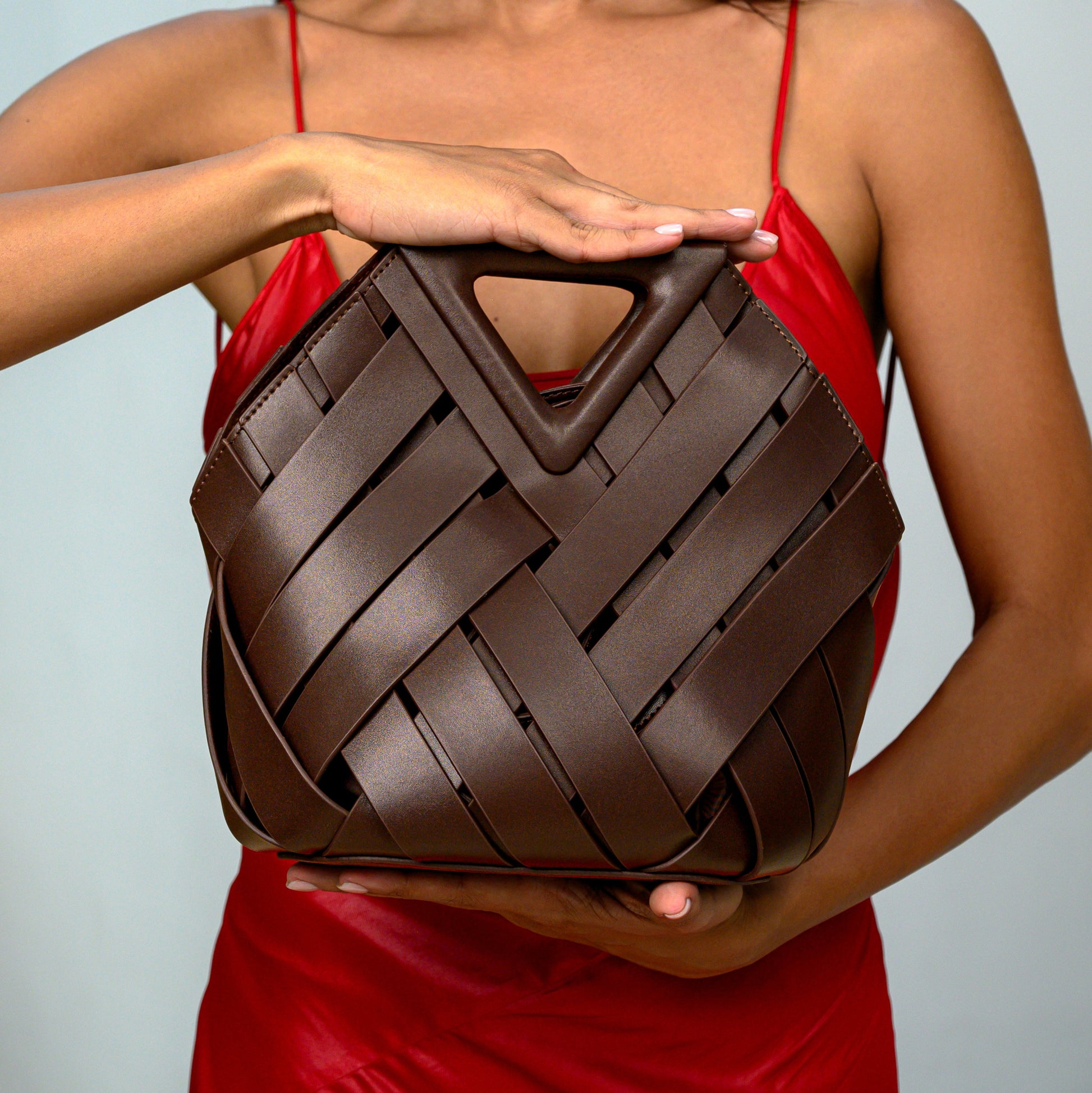 Stand out with a statement piece that reflects your individuality. Featuring a distinctive inverted triangle handle, this woven bag brings a modern twist to timeless craftsmanship. Each woven detail showcases exceptional artistry, combining style and practicality in a truly elegant design.
